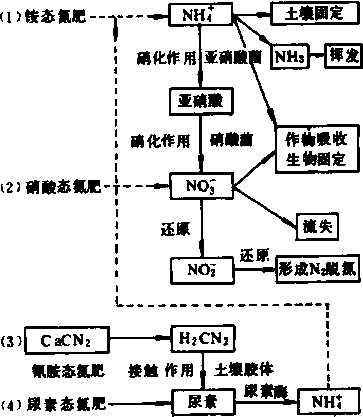 硝铵态氮肥的共性是:❶助燃烧和爆炸性; ❷吸湿性强; ❸遇热或碱性物质时会分解出氨气,故在碱性和石灰性土壤中也会发生氨挥发损失; ❹作物吸收后呈生理中性反应,属生理中性氮肥; ❺同时含有NH+4和NO-3,除了硝铵态氮兼宜的作物以外,也是一般旱地作物较理想的氮肥。与硝酸铵相比,其余的两种硝铵态氮肥的助燃烧、爆炸性和结块性较低,松散性也较好。 硫硝酸铵为等摩尔数的硫酸铵和硝酸的复盐,分子式为(NH4)2SO4·2NH4NO3。商品名称为列那硝、蒙丹硝。目前在欧美国家应用较多,中国尚未生产。产品通常为淡黄色或黄色颗粒,易溶于水,吸湿性和燃烧性均明显小于硝铵;松散性好,不易结块,便于贮存和使用。含氮量一般为25%~27%。其中18%~19%为铵态氮,7%~8%为硝态氮,故属生理酸性氮肥,在受热和碱性物质的作用下,也会分解出氨气。其农化性质介于硫铵和硝酸铵之间,适合施用于一般土壤和作物;作基肥、追肥均可,但以作追肥为好,用法同硝铵。施用量视作物、土壤肥力等情况而定。 硝酸铵钙又名石灰一硝酸铵。为硝酸铵和石灰石(或白云石)粉的熔合物,也可由硝铵与适量的石灰粉、白云石粉混合制成。成分为NH4NO3和CaCO3。一般组成是NH4NO3占55%~60%,CaCO3占40%~45%;含氮量约为20%,呈灰白色、灰褐或灰绿色粉末或颗粒;能溶于水,水溶液呈弱碱性反应;吸湿性较硝酸铵强,但其持水量大,故不易结块,且在较好的贮存条件下,仍能保其较好的散落性;每立方米肥料重量约1.2吨。硝酸铵钙适用于一般土壤,在缺钙的强酸性土壤上效果尤佳。一般做旱地作物追肥,肥效与硫酸铵相当;用在水田则不及硫酸铵。施用时可配施磷肥,但因其含碳酸钙会降低后者水溶性磷含量,故两者不要混施。 酰胺态氮肥 养分标明量为酰胺形态的氮肥。包括尿素及其衍生物脲甲醛(UF)、脲异丁醛(IBDU)、草酰胺等一些缓释氮肥。酰胺态氮肥含氮量高,物理性较好,贮运和施用方便,成本低,能不同程度地溶于水,并在土壤中能较快地转化为更易为作物吸收的铵态氮。故其肥效介于硝铵态氮肥与氰氨态氮肥之间。 氰氨态氮肥 养分标明量为氰氨形态氮的氮肥。专用作氮肥的氰氨态氮仅有氰氨化钙(石灰氮);另一氰氨态氮双氰胺则试用于作脲酶抑制剂。氰氨态氮难溶于水,其主要成分和水解中间产物对农作物都有毒害作用,在土壤中须经彻底转化才能为作物吸收利用,肥效缓慢。 氮溶液 养分标明量为多种形态氮的溶液肥料,亦称为氨络物。由硝酸铵、尿素或其它铵盐溶于液氨、浓氨水或水中混合而成的一种液体氮肥。呈无色透明或带黄色,含氮量范围较宽,一般在30%~40%,高者达50%以上。氮溶液有统一的命名规定。例如414(19-66-6)氮溶液,表示其总氮量41.4%,指由 19%氨、66%硝酸铵和6%尿素配制而成。按其游离氨浓度又分为有压和无压氮溶液两种,前者含有游离氨而产生明显的蒸气压,在操作温度下蒸气压较高,需备有高压处理装置和容器;后者不含游离氨,无须用高压罐和高压装置进行处理和贮存。与液氨和氨水原液相比,氮溶液的主要特点是:❶溶液的pH值比氨水低而含氮量比氨水高; ❷蒸气压相对低(15℃时约在0.4×105~1.5×105帕之间)、氨的挥发性较小,故贮运中一般无需用耐高压容器; ❸对钢仍有腐蚀,因而装运容器应以不锈钢和铝制的装酸槽车为宜; ❹当温度低至某一程度时,氮溶液中的可溶性盐会出现盐析现象。这种盐析温度决定其一年当中最适宜的室外贮存和田间施用时间。因具上述特点,它的发展速度比液氨和氨水为快,正逐步成为世界上重要的氮肥品种之一。 合理施用 根据作物特性、土壤性质和气候等方面的差异,采用相应的氮肥品种和施用量,施肥时期及施用方法,是合理分配和施用氮肥的基本依据。 作物营养特性 作物种类、品种和生育期不同,对氮素的需求量不一。水稻、小麦和玉米等谷类作物,需氮量较多,甘蔗、叶菜类、桑、茶等需氮量更大,而豆科作物(含绿肥和饲料作物)则需要量较少。一般作物的营养期需氮量高于生殖生长期,故应根据作物不同生育阶段,看苗分次施用氮肥。氮肥施用过量,容易引起贪青迟熟,病虫害增多,从而导致减产和产品品质下降等不良后果。 不同作物种类、品种和生育阶段,对氮素形态及其伴随的副成分的反应也有差别,因而对氮肥品种的适宜性也不同。小麦、玉米等各类作物,施用铵态氮、硝态氮及酰胺态氮(尿素)都能获得好的效果。烟草施用同时含有铵态氮和硝态氮的肥料,可以改善烟草的品质(如味香、燃烧性好);但烟草忌用含氯的各种氮肥。马铃薯既喜铵态氮,又需硫较多,而氯对其淀粉形成有影响,故以施用硫酸铵等含硫不含氯的铵态氮肥为佳。甜菜及 一些蔬菜作物,对硝态氮的吸收利用效率好,宜施用硝态氮肥,尤其是甜菜更宜施用含有钠离子的硝态氮肥。 土壤性质 土壤中可供植物吸收的氮绝大部分是铵态氮和硝态氮,其数量主要取决于氮肥的施用量和土壤有机氮矿化速度,生物固定及损失等转化途径之间的平衡状况。土壤氮的主要转化途径见图2。 土壤的供氮特性和氮肥的增产效益是土壤氮素转化和氮肥施用等综合作用的结果。就中国多数土壤的供氮和氮肥效益而言,将氮肥优先用于中、低产地区或耕地,其增产效益显著高于集中用在高产地区或小面积高产耕地。此外,土壤的一些具体特性也会影响氮肥增产效果,如在酸性土壤上,化学碱性和生理碱性的