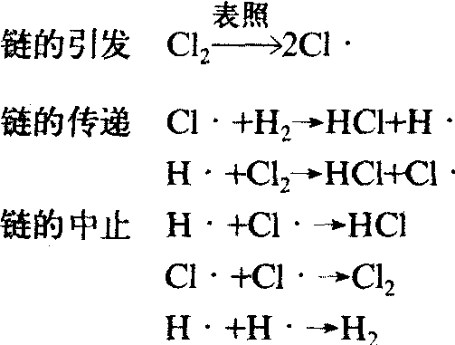 | 释义 | 氯气与氢气见光爆炸实验 氯气与氢气见光爆炸实验luqi yu qingqi jianguangbaozha shiyan该反应为典型的链锁反应,因反应迅速,能引起爆炸。反应机理如下: