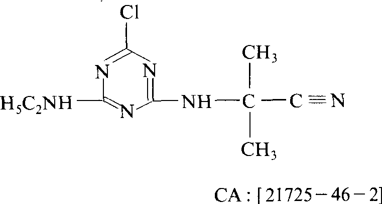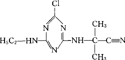氰草津cyanazine土壤兼茎叶处理内吸传导选择性持效期略短的氯三氮苯除草剂。又名草净津、百得斯、Bladex。化学结构式:  1971年首先由英国壳牌(Shell)公司开发。 性能 纯品为白色结晶,熔点166.5 ~167℃,20℃时蒸气压为199.98×10-9帕,25℃水中溶解度为171毫克/升,乙醇中为45克/升,氯仿中为210克/升,对光和热很稳定。在中性、微酸性或微碱性介质中可水解。大鼠口服LD50为 182 ~ 288毫克/千克,在哺乳动物体内迅速被代谢和排出,对虹鳟鱼LC50为5毫克/升。 氰草津主要被根吸收,也可通过叶部吸收,通过抑制光合作用发挥除草活性,使杂草死亡。玉米体内含有酶使其水解或形成轭合物而丧失毒性,使玉米安全。土壤粘粒能吸附氰草津,在土壤中的移动性比西马津大,在潮湿的土壤中半衰期为14~16天,持效期2~3个月,比莠去津降解快对后茬小麦的种植无影响。土壤中微生物能分解本剂。 应用 氰草津适用于玉米、豌豆、蚕豆、马铃薯、棉花等作物地中,防治多种一年生禾本科和阔叶杂草,施药时期为播种后出苗前,土壤喷雾处理或苗后杂草2~4叶期茎叶喷雾。土壤处理每公顷1.8~2.4千克,叶面茎叶喷雾1.2~2.0千克。可与莠去津混用,以扩大杀草谱和缩短残留期。土壤湿润有利于药效的发挥,春天土壤干旱时,施药后浅耙混土有利药效的发挥。氰草津cyanazine又称百得斯、草净津。三氮苯类内吸、选择性除草剂。化学名称:2-氯-4-(1-氰基-1-甲基乙胺基)-6-乙胺基-1,3,5-三氮苯。化学结构式如下。原药为白色结晶固体,熔点166.5~169℃,20℃时蒸气压为213.3×10-9 Pa,不易挥发,微溶于水,易溶于乙醇、三氯甲烷、苯、甲基环己酮等有机溶剂,对光和热稳定,在中性、微酸性或微碱性介质中水解。药剂可通过根及叶面吸收,抑制光合作用,使植物饥饿死亡。可用于玉米、小麦、大麦、蚕豆、豌豆、马铃薯及甘蔗田,防除一年生禾本科杂草和阔叶杂草。对人、畜中等毒性,大鼠急性口服LD50为182~334 mg/kg,兔急性经皮LD50>2 000 mg/kg。