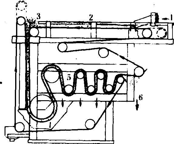 图2 带式榨汁机工作原理 1.进料口; 2.预排汁区;3.垂直排汁区; 4.压纹滚筒榨汁区;5.S形榨汁区; 6.出渣口 果汁、果酒过滤设备 用于清除果汁或果酒中的各种固体浑浊物的设备。常用的有板框式、硅藻土滚筒式、盘式硅藻土式、烛式、真空式、单室离心式、多室离心式、碟形离心式和螺旋离心式等过滤机。图3为板框式过滤机的工作原理图,浑浊果汁或果酒从进液口进入,被过滤层过滤,浑浊物留在机内,澄清果汁或果酒从出液口流出机外。常用的过滤层材料为石棉、珠光岩、硅藻土、天然纤维或它们的混合物。