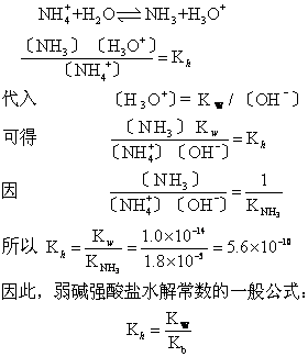 〔H+〕〔OH-〕 =Kw或 〔OH-〕 =Kw/ 〔H+〕 ,代入水解常数表示式: