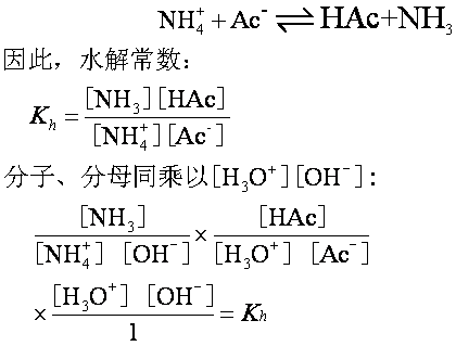 由于Ka,Kb几乎相等,所以两种离子水解程度几乎相等。水解产生的H3O+和OH-,因超过水的离子积,立刻化合成水,结果溶液在水解过程中始终保持中性。水解可看成上述两个反应式与H3O++OH-