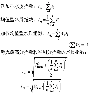 C max 评价标准容许的pH最高值;C min 评价标准容许的pH最低值。另一种求分指数的方法是水质评分法。采用此法时,列入水质指数计算模式的水质参数一经选定,必须按设计者意图或征询较多有关专家的意见,对各个水质参数所表示的水质进行评分。例如确定水中具有不同溶解氧含量时应分别给予多少评分。评分法中,通常对监测数据较好的水质给予较高的评分值,对最满意的水质可给予100分,对最差的水质可给予0分。对选用的各个水质参数,均须确定一个评分尺度。这时各个水质参数的分指数可表示为: Pi=qi 式中: Pi 某水质参数的分指数; qi 根据该水质参数实测平均浓度(或中位数)查评分尺度(一般可用图或表的方式表示)获得的对该水质参数的评分。 各个水质参数的分指数用评分法或比值法确定后,即可将各分指数综合而成水质指数。综合计算水质指数,目前有以下几种方法: