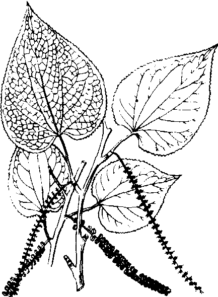 水青树tetracentronTetracentron sinense Oliv.,水青树科,水青树属。落叶乔木,高达40 m,胸径1.5 m。树皮灰褐色,老时片状剥落。具长短枝,长枝细长,下垂,短枝密生叶痕和芽鳞痕。叶纸质,互生,宽卵形,长7~10 cm,先端渐尖,基部心形,密生腺锯齿,下面被白粉,掌状5~7脉;柄长2~3 cm。花小,两性,穗状花序,下垂。蒴果4深裂,宿存花柱位于果基部,长3~5 mm,棕色。种子4~6,条状长圆形,长2~3 mm,有棱脊。分布于甘肃、陕西、湖北、湖南、四川、贵州、云南等省区。生于海拔1 400~3 000 m林地的林缘或林中。喜光,喜生于气候凉润,酸性土山地。中国特产稀有树种,系孑遗的被子植物,注意保护母树,扩大造林。树姿优美,可供观赏。