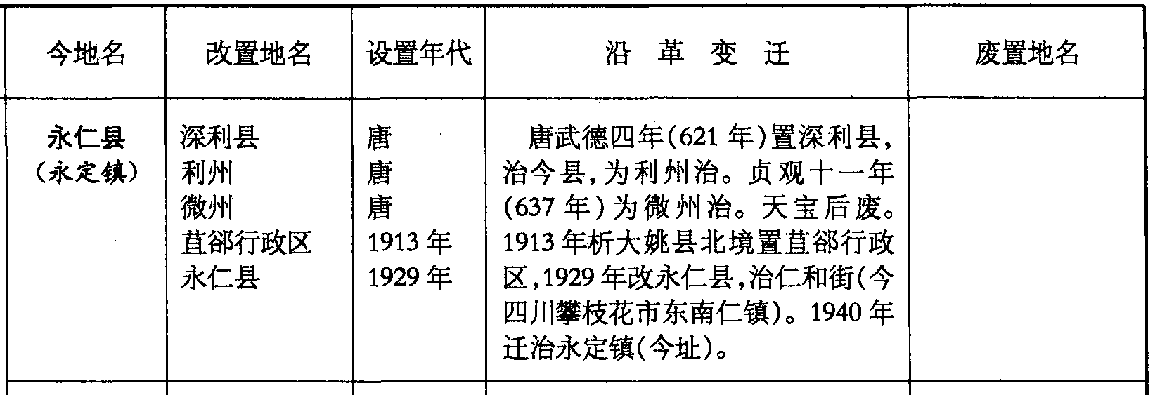 永仁县(永定镇)深利县利州微州苴郤行政区永仁县唐唐唐1913年1929年唐武德四年(621年)置深利县,治今县,为利州治。贞观十一年(637年)为微州治。天宝后废。1913年析大姚县北境置苴郤行政区,1929年改永仁县,治仁和街(今四川攀枝花市东南仁镇)。1940年迁治永定镇(今址)。