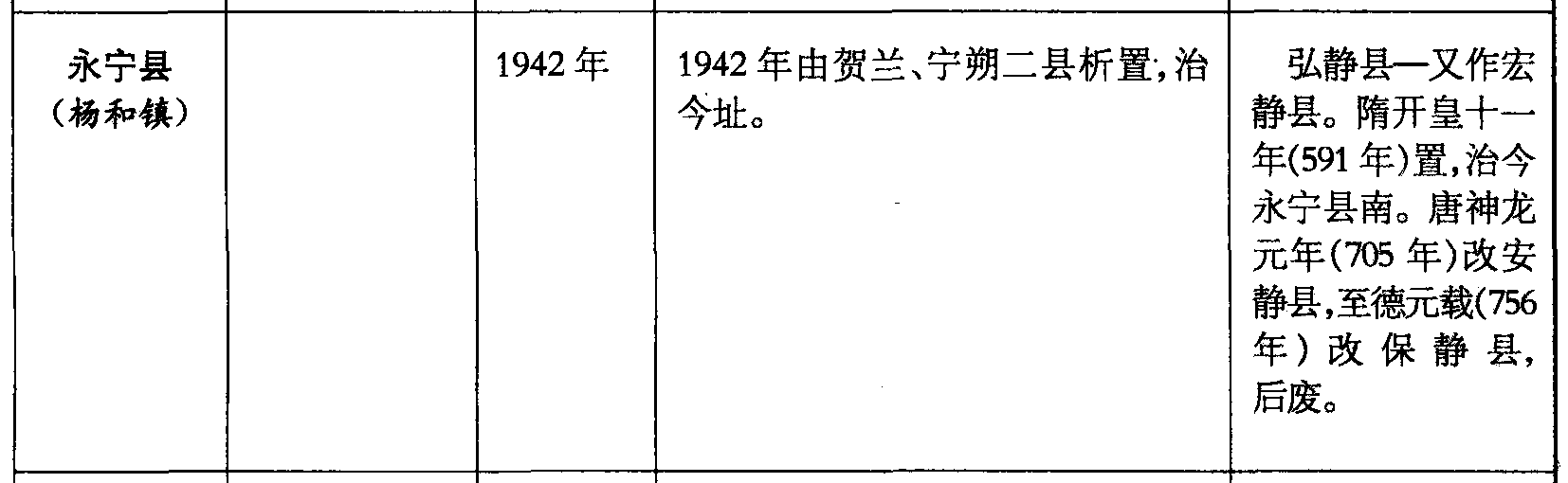 永宁县(杨和镇)1942年1942年由贺兰、宁朔二县析置,治今址。弘静县—又作宏静县。隋开皇十一年(591年)置,治今永宁县南。唐神龙元年(705年)改安静县,至德元载(756年)改保静县,后废。