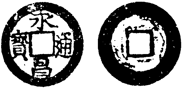 | 释义 | 古代名物 > 貨幣類 > 銅鐵錢部 > 明 > 永昌通寳 永昌通寳 yǒngchāngtōngbǎo 明末起義軍首領李自成稱王西安國號“大順”建元“永昌(公元1644—1645年)”時鑄。有小平、折五兩種,面文真書,直讀,“永”字多由“二”、“水”組成作“”,背光無文。小平徑二·四至二·五厘米,重三·四至三·九克;折五一值明錢百,徑三·六厘米,重約十三克。《明史·李自成傳》:“〔自成〕鑄金璽及永昌錢,皆不就。”《茶巖逸考》:“崇禎十七年正月,李自成稱王於西安,據秦府爲宫,僭號大順,建元永昌,鑄永昌通寳錢。”