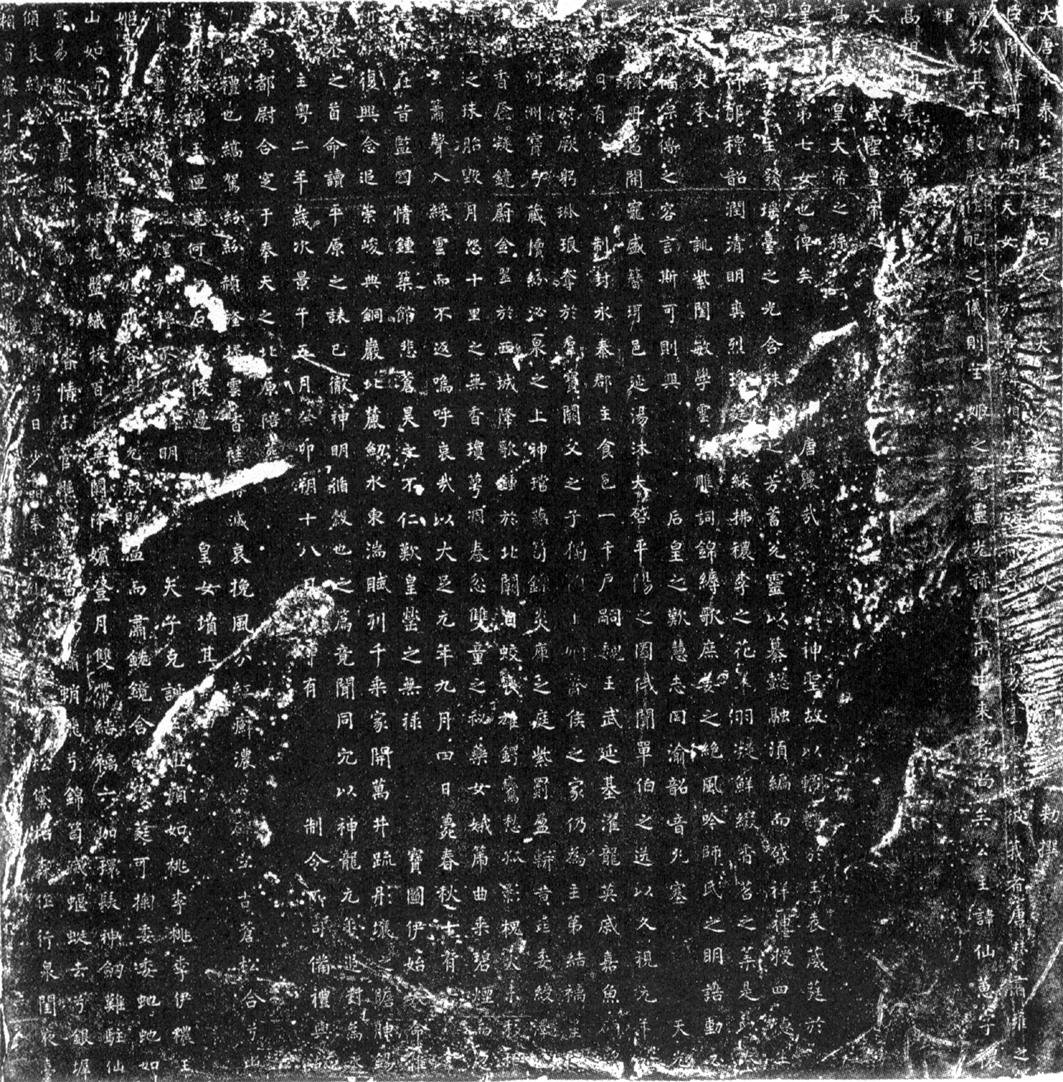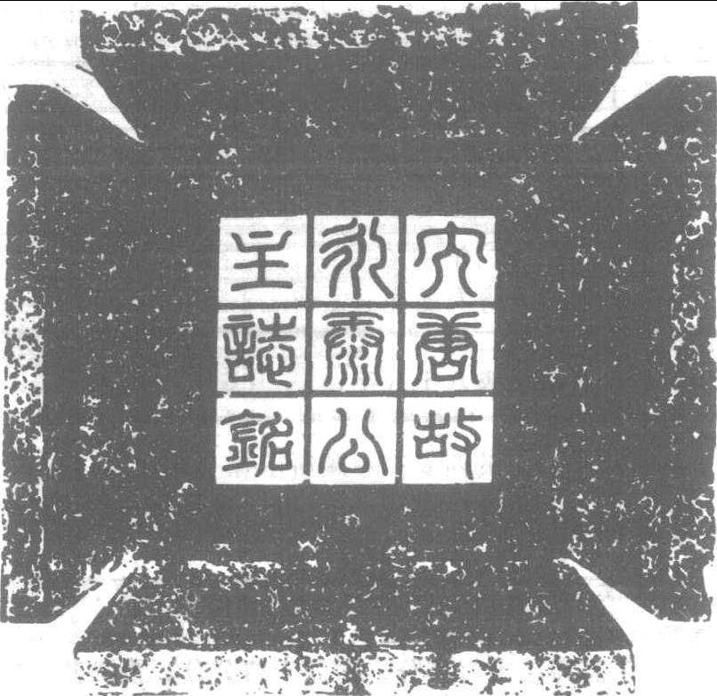 永泰公主墓志·蓋 唐·神龍二年(706)刻。正書三十一行,行三十一字蓋篆書題“大唐故永泰公主志銘”九字。徐彦伯撰,書者不詳。書風緊嚴遒麗,呈盛唐藝術格韵。惟字體大小不甚一致,且有錯字。志文凡涉及皇帝,皆提行或空三格或空二格,亦不統一。永泰公主係高宗(李治)舆則天武后之孫女,嫁武后侄孫武延基,坐罪死。中宗 (李顯)復位,大造墳墓以改葬。墓志與蓋均精刻豪華,格調高雅。墳墓入口至後室長八十七米,墓底深十六米,規模宏偉,為唐朝皇權、經濟、藝術之集中體現。一九六○年九月發掘墳墓時,出土於唐乾陵東南約三華里之陪葬墓中。今存乾陵博物館。 |