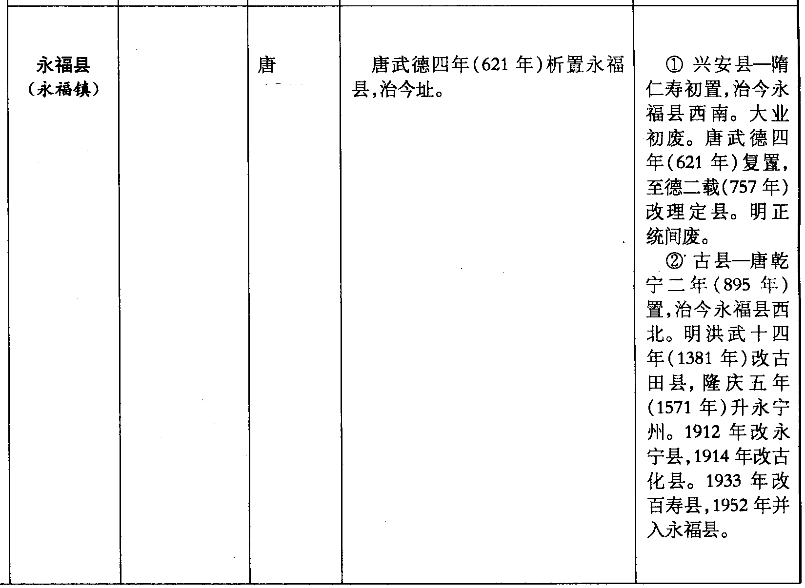 永福县(永福镇)唐唐武德四年(621年)析置永福县,治今址。❶ 兴安县—隋仁寿初置,治今永福县西南。大业初废。唐武德四年(621年)复置,至德二载(757年)改理定县。明正统间废。❷古县—唐乾宁二年(895年)置,治今永福县西北。明洪武十四年(1381年)改古田县,隆庆五年(1571年)升永宁州。1912年改永宁县,1914年改古化县。1933年改百寿县,1952年并入永福县。