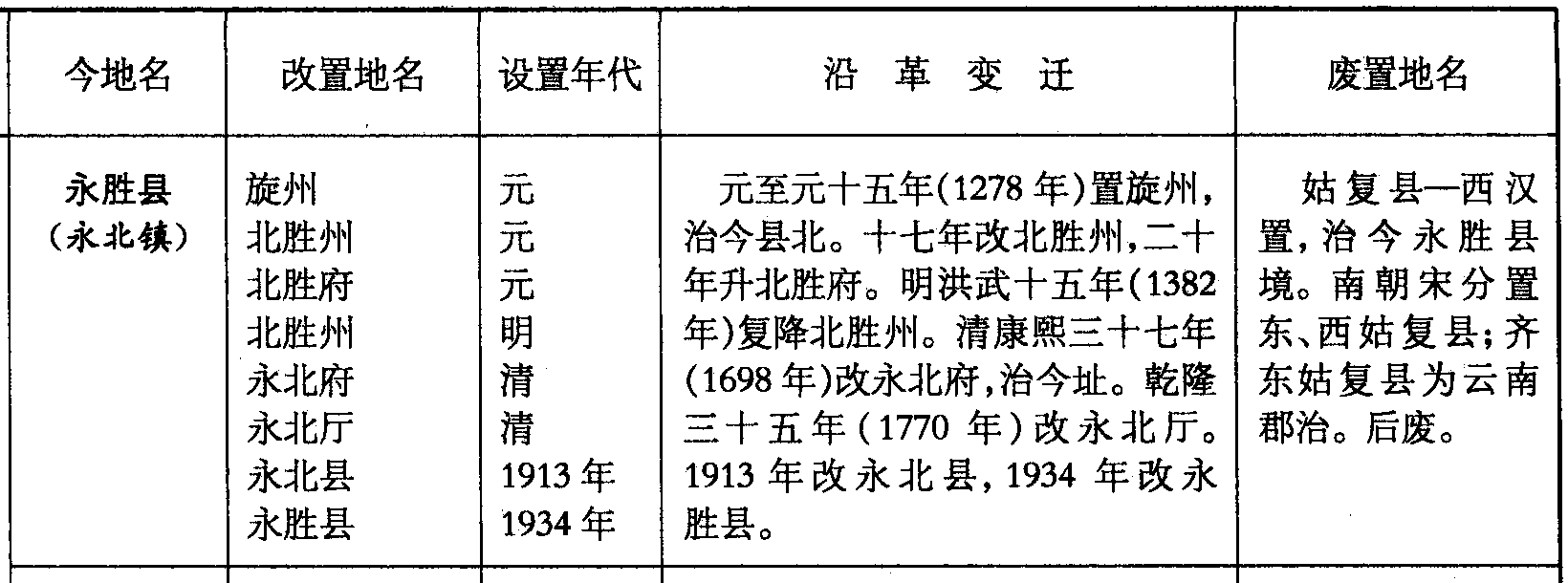 永胜县(永北镇)旋州北胜州北胜府北胜州永北府永北厅永北县永胜县元元元明清清1913年1934年元至元十五年(1278年)置旋州,治今县北。十七年改北胜州,二十年升北胜府。明洪武十五年(1382年)复降北胜州。清康熙三十七年(1698年)改永北府,治今址。乾隆三十五年(1770年)改永北厅。1913年改永北县,1934年改永胜县。姑复县—西汉置,治今永胜县境。南朝宋分置东、西姑复县;齐东姑复县为云南郡治。后废。