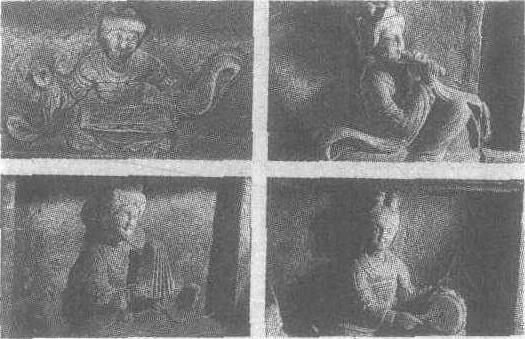 五代前蜀。四川成都永陵王建墓石刻。乐伎共24人,高24厘米至25厘米,刻于棺床须弥座的南、东、西三面束腰上。南面(为其正面)中间为两个长袖飘拂,翩然起舞的舞伎,其左、右为一弹琵琶,一击拍的乐伎。研究者认为这两个乐伎是乐队的领队,故与舞伎同刻正面。东、西两面各为十个手执不同乐器的乐伎坐像。乐器有:箜篌、筝、觱篥、笛子、箎、笙、箫、正鼓、和鼓、毛员鼓、齐鼓、答腊鼓、鸡娄鼓、羯鼓、铜钹、吹叶、贝、拍板等。乐伎或侧耳聆听,或微笑起奏,或悠然吹弹,或抚琴沉思……各具神态。这群石雕乐伎,不只在雕刻艺术上具有很高的水平,而且表现了一个完整的乐队,为研究唐、五代的音乐和乐队组织提供了极为重要的资料。