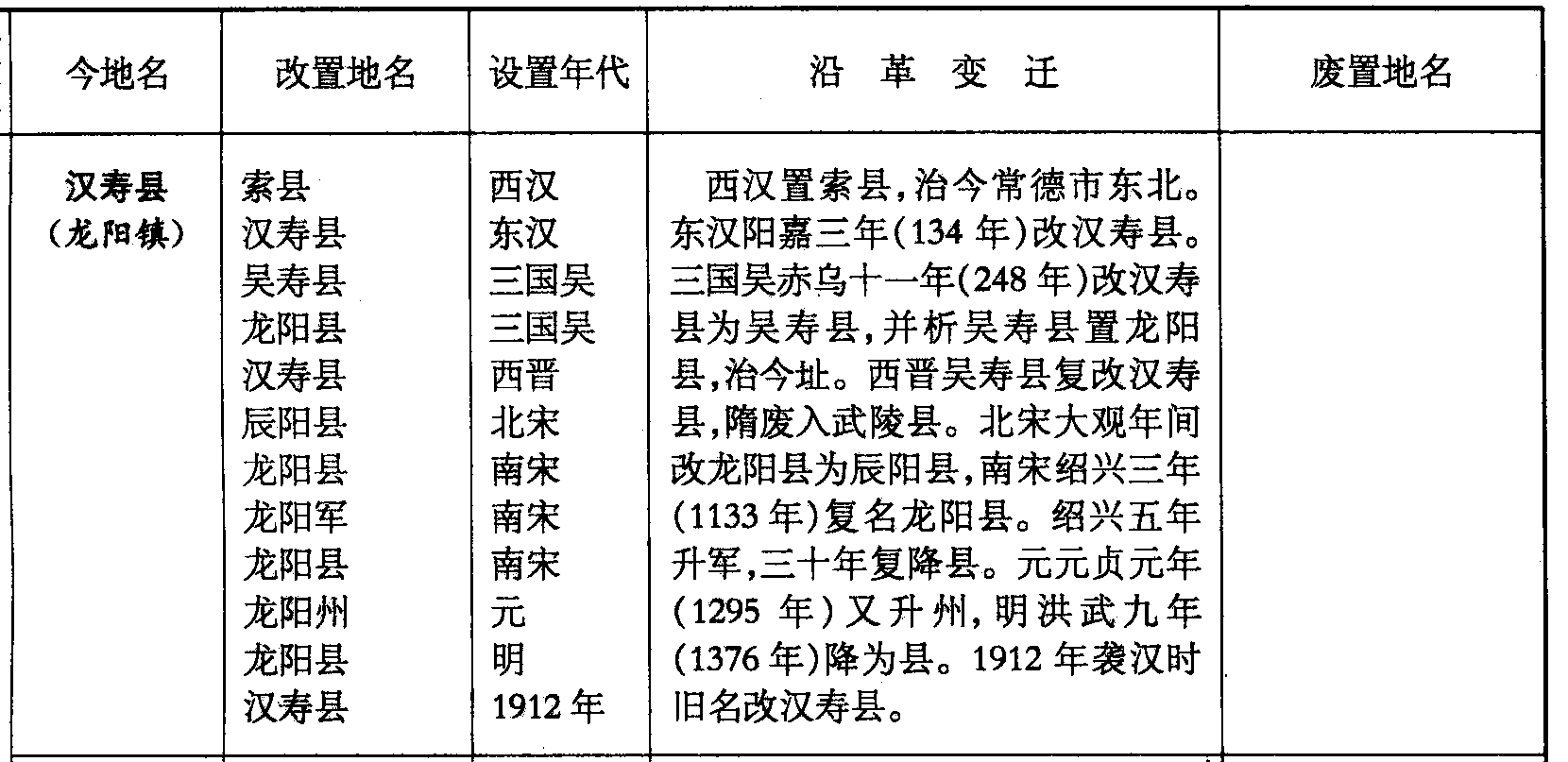 西汉置索县,治今常德市东北。东汉阳嘉三年(134年)改汉寿县。三国吴赤乌十一年(248年)改汉寿县为吴寿县,并析吴寿县置龙阳县,治今址。西晋吴寿县复改汉寿县,隋废入武陵县。北宋大观年间改龙阳县为辰阳县,南宋绍兴三年(1133年)复名龙阳县。绍兴五年升军,三十年复降县。元元贞元年(1295年)又升州,明洪武九年(1376年)降为县。1912年袭汉时旧名改汉寿县。