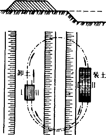 图2 铲运机环行作业 推土机修筑渠道、土堤时,通常采用横向推土的方式,如图3。较小型沟渠可用斜向推土作业。为了减少土壤漏失,可采用开槽推土法,即推土机沿一条固定的路线推土,以推出两旁具有侧埂的沟槽,达到预定深度后移到邻区作业,最后清理找平。对坚硬土壤,在推土前先用松土机疏松土壤,以提高效率。
