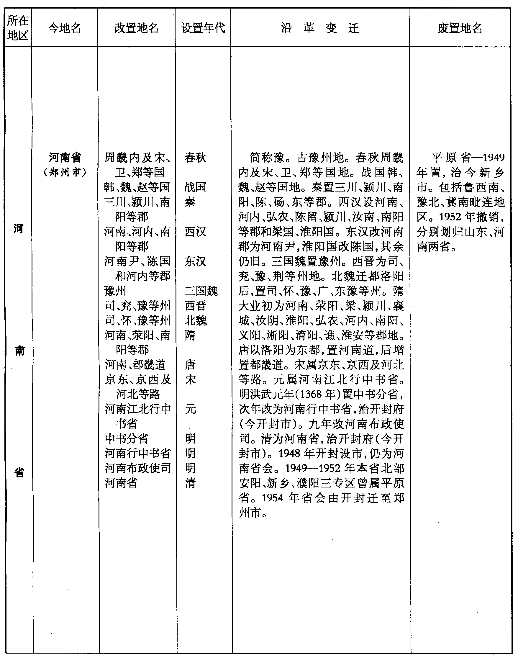 简称豫。古豫州地。春秋周畿内及宋、卫、郑等国地。战国韩、魏、赵等国地。秦置三川、颍川、南阳、陈、砀、东等郡。西汉设河南、河内、弘农、陈留、颍川、汝南、南阳等郡和梁国、淮阳国。东汉改河南郡为河南尹,淮阳国改陈国,其余仍旧。三国魏置豫州。西晋为司、兖、豫、荆等州地。北魏迁都洛阳后,置司、怀、豫、广、东豫等州。隋大业初为河南、荥阳、梁、颍川、襄城、汝阴、淮阳、弘农、河内、南阳、义阳、淅阳、淯阳、谯、淮安等郡地。唐以洛阳为东都,置河南道,后增置都畿道。宋属京东、京西及河北等路。元属河南江北行中书省。明洪武元年(1368年)置中书分省,次年改为河南行中书省,治开封府(今开封市)。九年改河南布政使司。清为河南省,治开封府(今开封市)。1948年开封设市,仍为河南省会。1949—1952年本省北部安阳、新乡、濮阳三专区曾属平原省。1954年省会由开封迁至郑州市。