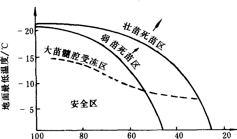 5cm土壤田间持水量% 油菜越冬死苗与土壤水分、最低温度的关系图 |