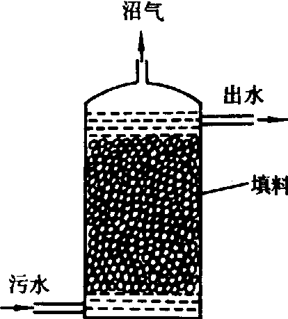 图3 厌氧接触工艺 厌氧滤器消化工艺 是一种采用截面菌种过滤技术的装置(图4),消化器内填充有惰性介质,通常采用颗粒直径为25~38毫米的碎石、卵石、焦炭、煤渣、各种形状的塑料制品、陶土制品或软性纤维填料。微生物尤其是产甲烷菌,呈膜状附着于惰性介质的表面,并在介质颗粒之间的空隙里互相粘附成颗粒状或絮状物存留下来。当有机污水向上流动通过生物膜时,微生物获得营养物质和能量而生长,有机物被细菌消化而去除。滤器中填料的空隙率约占总体积的40%,随微生物生长、生物膜增厚,会导致滤器堵塞。这是该工艺存在的主要问题。污水中COD的去除率不仅与水力滞留期(HRT)有关,而且在很大程度上取决于污泥滞留期(SRT)。根据美国科学家麦卡蒂(P. L. Mecarty)等的实验结果(图5),在一定时间范围内,在HRT不变的情况下,COD的去除率与SRT呈正相关。许多实验表明,在保持同样去除率的情况下,提高SRT可以大大缩短HRT,从而缩小消化器的体积。这种将SRT与HRT分开,使发酵器内积累尽可能多的活性污泥的做法,推动了厌氧消化技术的发展。