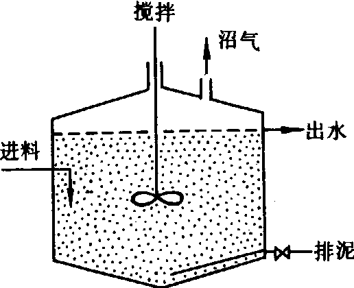 图1 常规消化器示意 全混消化工艺 在消化器中设有搅拌装置使发酵料液处于完全混合状态,改变了常规消化工艺料液分层现象,使微生物的活动区遍布整个消化器,因而其消化速度比常规消化工艺有明显提高(图2)。采用该工艺常在恒温下连续投料运转,进入消化器的高浓度原料,很快与消化器内全部发酵液混合,原料被稀释,经消化后排出的料液浓度,与消化器内参与反应的料液浓度相等,因而出料过程中,发酵微生物也随之排出,增加了出料浓度,减少了消化器内微生物的数量。为了维持消化能力,微生物的排出速度不得高于微生物生长速度,即发酵原料的滞留期不能低于活性污泥的倍增时间。因此要定出合理的滞留期,并加大进料浓度。一般进料COD(化学需氧量)浓度不应小于5000毫克/升,也就是说,该工艺不适宜低浓度有机污水的处理,而适用于处理高浓度有机污水及高悬浮固体含量的有机废物,如禽畜粪便等的厌氧消化。高速消化工艺在中温情况下一般负荷为COD 2~3千克/立方米·天,高温情况下为COD 5~6千克/立方米·天。