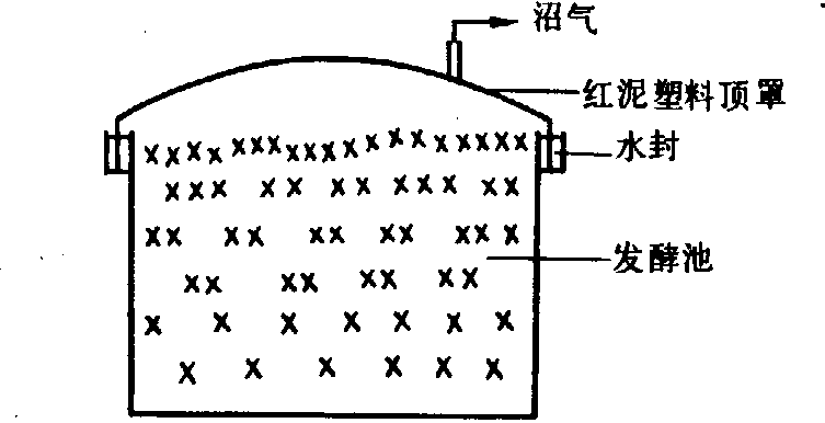 图8 两阶段沼气发酵工艺 干发酵工艺 以固体有机废物为原料,在少水条件下进行厌氧消化的一种工艺。1980年康奈尔大学根据美国能源部的要求首先进行了干发酵研究,用来处理农业废弃物或城市挥发性固体有机物。干发酵的干物质含量在20%左右较为适宜,干物质含量超过30%则产气量明显下降(图9)。由于干发酵时水分少,所生成的挥发酸得不到稀释,挥发酸的积累常引起pH值的严重下降,导致发酵原料酸化,沼气发酵停止。为了克服pH值的下降,常用方法有:❶加大接种物用量,使酸化和甲烷化速度能尽快达到平衡,一般接种物用量应为原料的30%; ❷增加高含氮原料用量,如人畜粪便等,以降低C:N比值,使原料在分解时所产生的挥发酸能被其所产生的氮中和; ❸将原料进行堆沤,使易于产酸的有机物质被氧化分解掉一部分。由于堆沤会造成料的浪费,所以在生产上应首先考虑采用前两种措施,中国山东省能源研究所的应用研究表明,采用批量投料发酵进行120天后,纤维素降解了53.5%,脂肪降解了45.9%,总碳消耗为34.68%,平均每千克干物质产气量为216.7升;在平均温度为26.7℃条件下,产气率平均为0.298立方米/立方米·天。干发酵要求便于进出原料,半塑式沼气池适用于干发酵工艺(图10)。