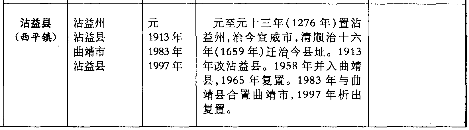 沾益县(西平镇)沾益州沾益县曲靖市沾益县元1913年1983年1997年元至元十三年(1276年)置沾益州,治今宣威市,清顺治十六年(1659年)迁治今县址。1913年改沾益县。1958年并入曲靖县,1965年复置。1983年与曲靖县合置曲靖市,1997年析出复置。