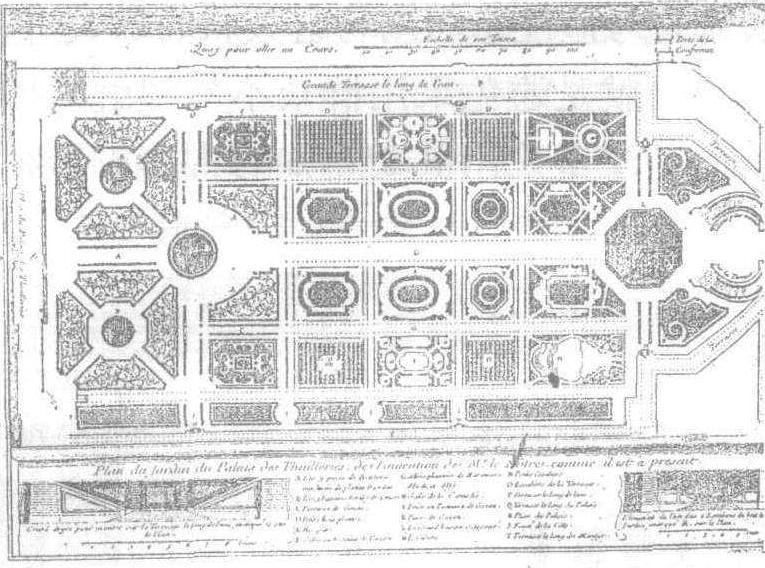 萌芽于罗马——高卢时期,16世纪初受意大利文艺复兴时期园林风格的影响,出现了台地式花园的剪树植坛、果盘式喷泉、岩洞等园林内容,后来结合法国地形平坦的条件,布置大片水渠和水池,形成以规模宏大为特色的园林风格,把古典主义追求人工美,在均衡匀称、井然有序和变化中寻求统一的造园原则用于园林设计中,形成了以几何形布局为主要特征的法国古典主义园林艺术。代表作品有17世纪下半叶法国宫庭建筑师勒瑙特亥设计建造的宫廷花园,其手法是把宫殿或府邸置于高地居统率地位,前面中轴线上伸出笔直的林荫道通向城市,建筑后部是中轴对称的几何形花园和林园,配以几条对称的次轴线,园内大路小径均形成严格的几何格网,交点处设置喷泉、雕像或小型建筑作为对景,布置规整的沟渠水面和喷泉,树木均修剪成各种统一造型的几何的形态,显示出统一豪迈的气派。土伊里花园(如图)等法国式园林的设计手法,对欧洲各国的园林深有影响。
