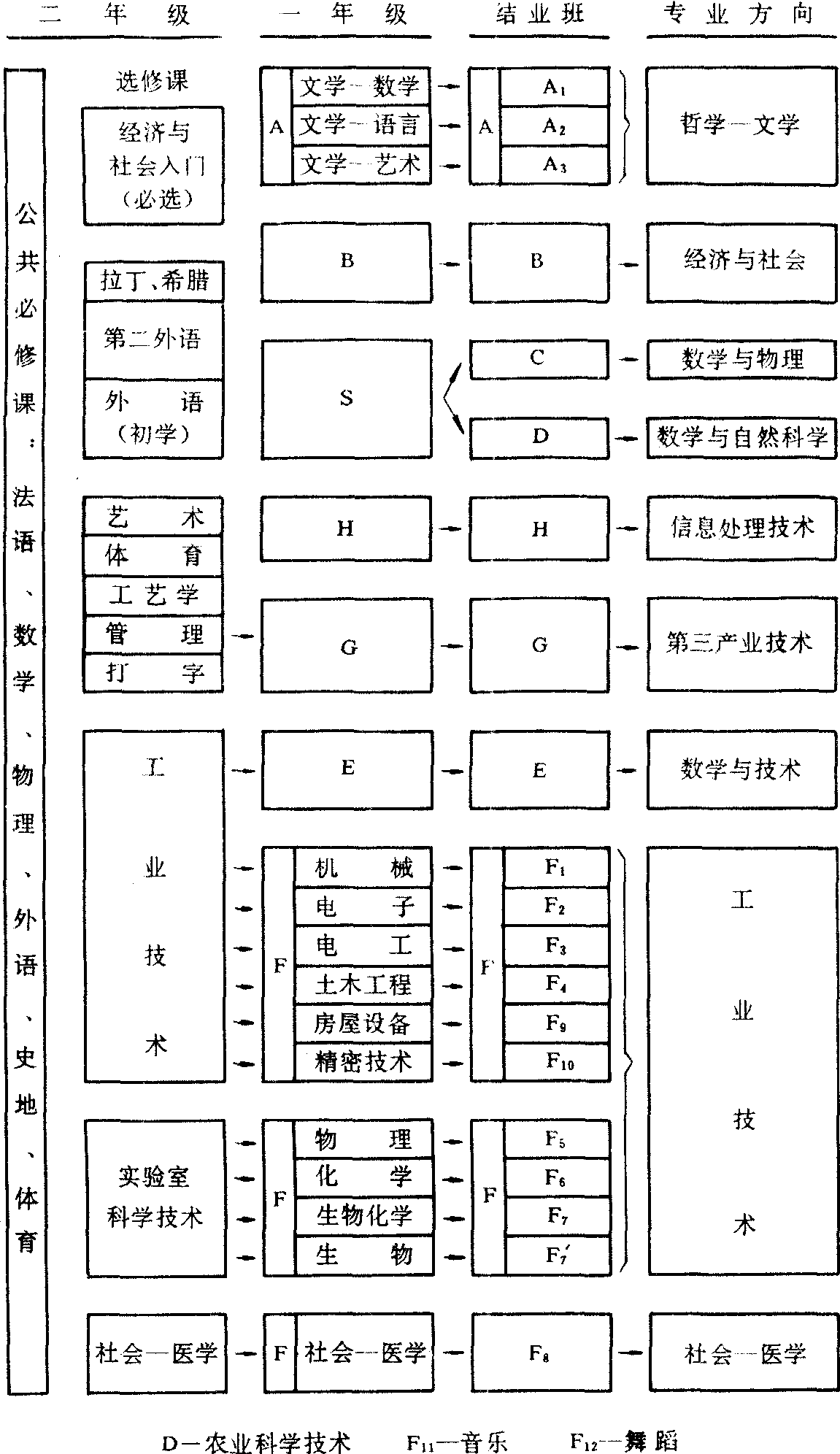 设A~E科者称普通高中,设F~H科者称技术高中。高中各科公共必修课有法语、哲学、史地、公民、外语、体育,其他为根据各科特点设置的科目。各科各门必修课的课时及其周总课时不同,后者为22~37小时。除必修课外,各科学生还必须或自愿学习一些选修课,它们不一定与主修方向有直接联系。高中毕业时,学生将参加他们上小学以来的第一次考试——毕业会考(baccalaureat)。高中各科考试的科目、时间、范围及评分方法均由教育部统一规定,各学区命题和组织考试。近年来这一考试的合格率约为2/3。除上述普通高中和技术高中外,法国还有职业高中(参见《法国职业教育》)。据法国教育部1988年统计,普通与技术高中有学生135.8万(分科后约为7∶4),职业高中有学生73.8万。 ☚ 法国初中教育 法国职业教育 ☛ |