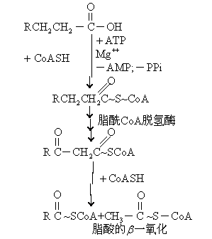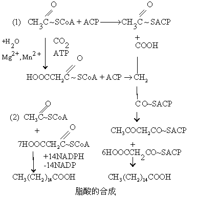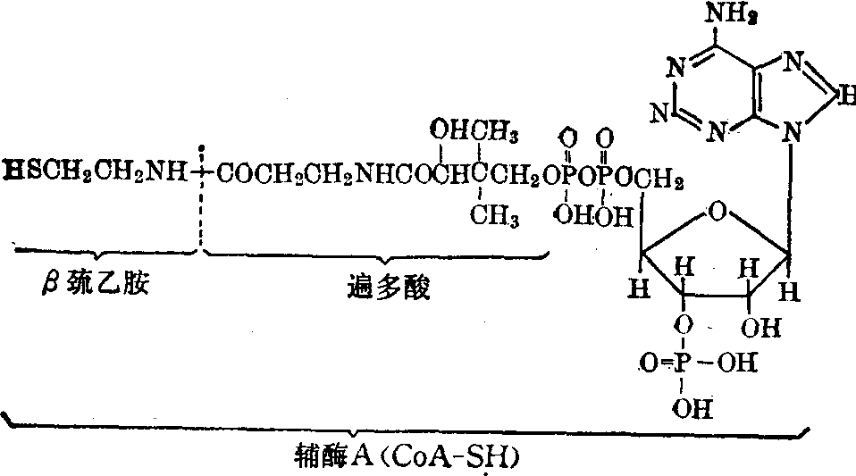 不论是脂酸分解或是合成代谢,CoA都起十分重要的作用。在β-氧化过程中脂酸必需先变成脂酰CoA,称为活化。然后在将长链分解成二碳单元的 “硫解”作用中又必需CoA参加,产生乙酰CoA。后者可进入三羧循环氧化供能,也可在肝中生成酮体或合成脂酸与胆固醇等。说明CoA在脂类合成代谢中同样十分重要。类固醇激素的合成原料来自胆固醇,故缺乏泛酸的动物肾上腺皮质结构与功能均受显著影响。 还有部分泛酸在体内与一特种蛋白质结合构成酰基载体蛋白ACP,它是脂酸生物合成的重要因素,含有4′-磷酸泛酰巯基乙胺与蛋白质的丝氨酸上羟基共价结合。这ACP内的泛酰巯基乙胺上也能通过硫酯键与脂酰基结合。ACP的分子量为9100,其--SH易与中等链长的酰基结合。在脂酸生物合成中,脂酰基的各种变化,无一不是与ACP成硫酯键结合进行的。与氧酯键相比硫酯键颇不稳定,水解时△G′也较高。 已研究过的生物无一不需要泛酸。大鼠缺乏泛酸时生长和生育均不良,黑鼠毛发变灰,肾上腺皮质有出血性坏死与功能低下,此时若用适量食盐或者皮质激素可以延长其寿命。缺乏泛酸的动物在临死之前其肝中含CoA的量只有正常动物的50%,不能利用丙酮酸以使PABA乙酰化。泛酸对人类的营养作用未曾研究,也未发现过泛酸缺乏症状。每日需要量估计为5~10mg。 泛酸广泛存在于食物中,但蔬菜、水果中较少,肉类、乳类中较多,而以酵母、肝和蛋类最富含泛酸。 ☚ 维生素B 生物素 ☛ 泛酸fàn suānacid regurgitation |