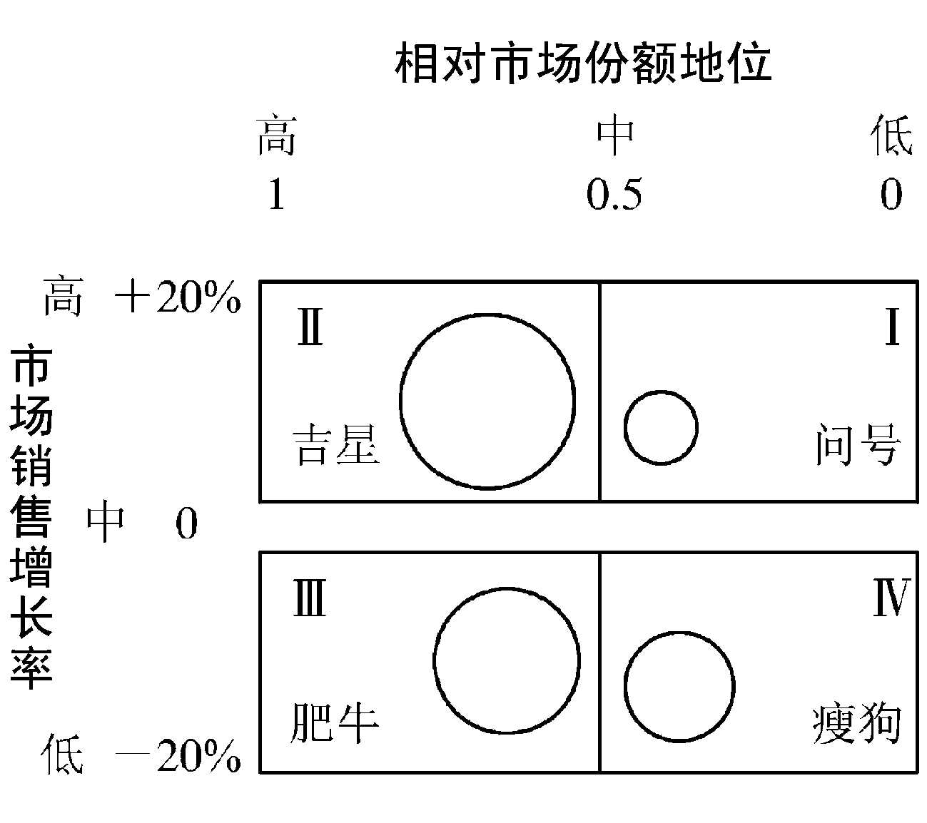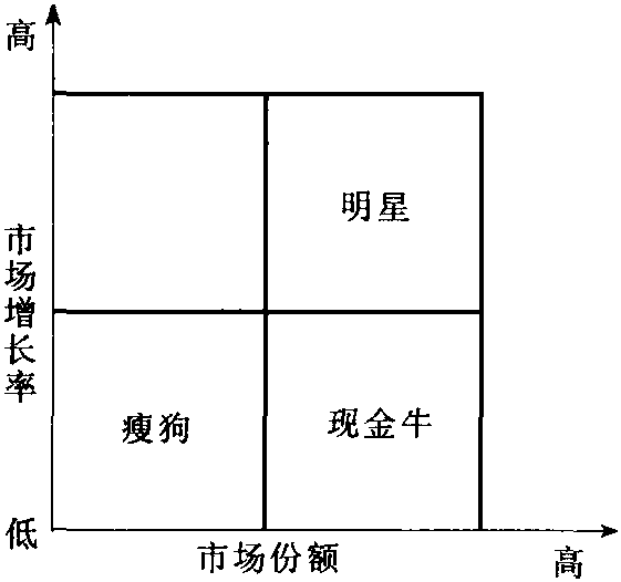 | 释义 | 波士顿矩阵又称“BCG矩阵”。企业在其战略管理中对自身内部条件进行分析的一种方法。由美国波士顿咨询集团于20世纪60年代提出。BCG是波士顿咨询集团(Boston Consulting Group)的英文缩写。该矩阵图把企业经营的各种产品按市场份额(市场占有率)和市场需求的增长速度(市场成长率)标定在四个象限里,并据此提出相应的战略选择。波士顿矩阵图中横轴代表相对市场份额地位,中位值设为0.5,表示企业的市场份额为该产业领先企业的一半;纵轴为产业市场销售增长率,范围由-20%至20%,中位值为0。四个象限分别冠以“问号”(第Ⅰ象限)、“吉星”(第Ⅱ象限)、“肥牛”(第Ⅲ象限)和“瘦