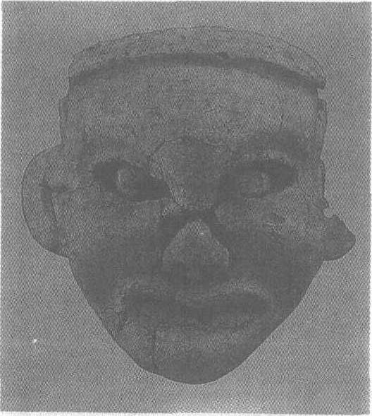 新石器时代红山文化。高22.5厘米。1983年辽宁省凌源县、建平县交界处牛河梁女神庙遗址出土。此头像为黄土所制,未经烧制。头像面庞方中见圆,前额、两鬓及面颊较宽,鬓角十分平整,颧骨隆起,眼眶斜下通鼻梁。眼窝较浅,嵌淡青色圆形玉片为睛,眼尾上挑。鼻梁较低,有残损。口较大,嘴角圆而上翘。耳宽平。专家认为此形象当属蒙古人种。根据其形象特征和头像附近出土的其他人体部位塑件判断,此为一女性塑像。头像的形象端庄,具有庄严、神秘的气质,富有生命力。这件与真人大小相同的头像在中国雕塑史上占有重要位置,它不仅具有较高的艺术价值,也是研究我国人种学、民族史、宗教思想史的重要标本。红山文化见“双兽首三孔玉器”条目。
