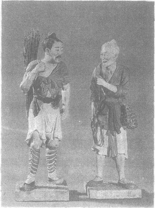 | 释义 | 泥塑渔樵问答像 泥塑渔樵问答像清。高52厘米。天津市艺术博物馆藏。此为天津“泥人张”创始人张长林的代表作。“泥人张”彩塑艺术历经四代,已有一百多年历史,其写实而夸张的造型和浓厚的装饰意趣载誉中外。张长林(公元1826—1906年)字明山,精于捏塑,尤善肖像,把泥塑从一般玩具提高到圆雕艺术的水平,又装饰以色彩,形成了泥人张的独特风格。此件作品采用渔樵问答的典故,塑造一身挎鱼篓、手提渔网的老年渔夫与一背负荆禾的壮年樵夫相路遇,俩人面带淳朴的笑容,相见亲切而愉快,互致问候并闲谈。作品来源于生活,真实自然,泥土气息浓厚,极具艺术感染力。