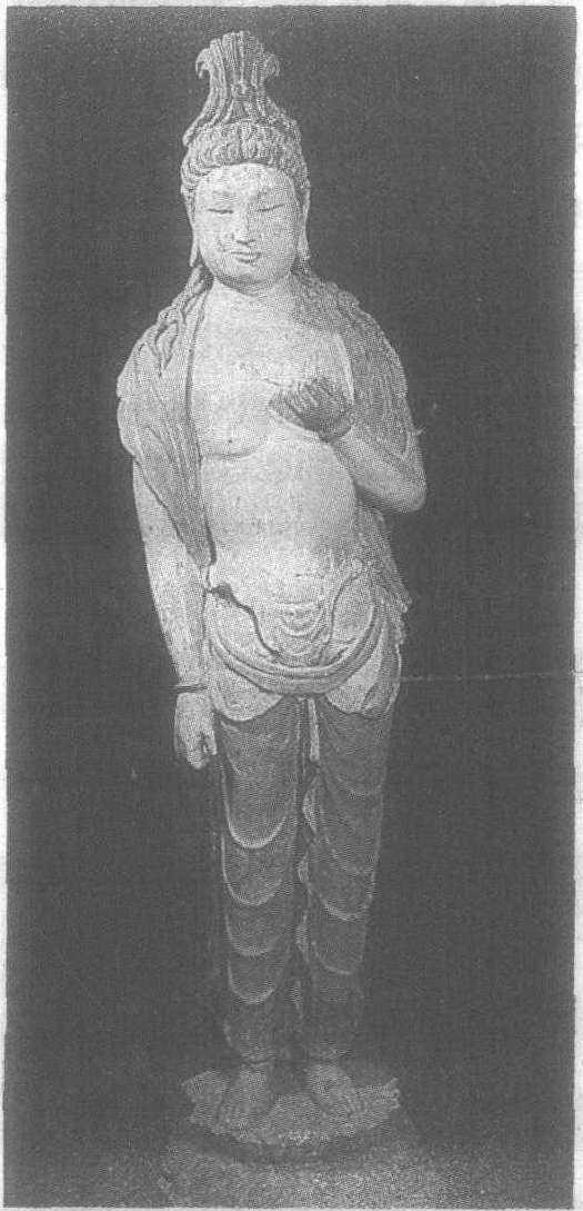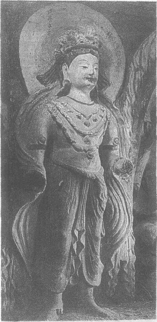 ☚ 石雕迦叶、阿难立像 彩塑天王立像 ☛ 泥塑菩萨像 泥塑菩萨像北凉。高135厘米。甘肃省张掖县金塔寺西窟中心柱东面下层龛外北侧塑像。头戴高宝冠,上身裸露,胸前缀满璎珞。质料具有轻薄之感的长裙系于腰间,裙紧贴双腿,显露出优美的曲线。肩披长巾自双肩绕下,迎风飞扬,飘逸潇洒。菩萨面形秀丽,五官灵巧,给人以纤柔之感。但其眉宇间又透出一股英气,外柔内刚,令人肃然起敬。