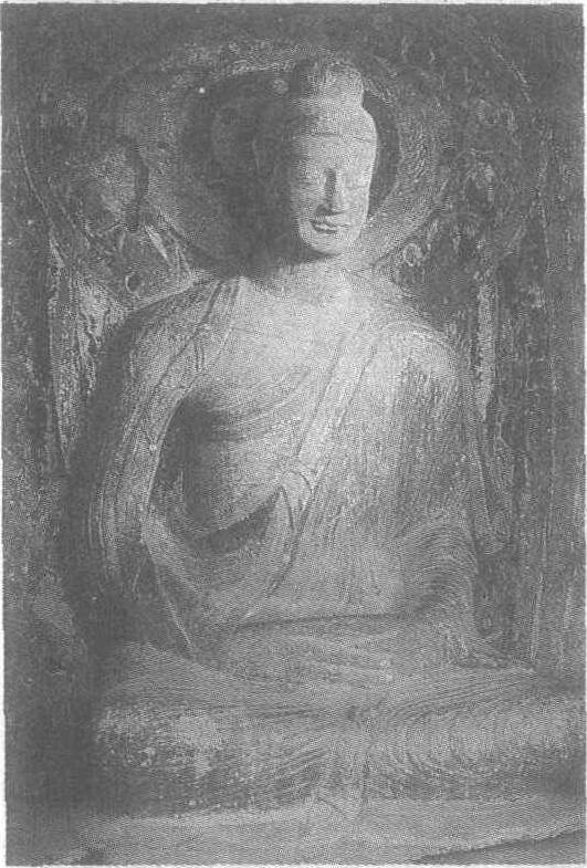 北魏。高140厘米。甘肃省天水县麦积山石窟第148窟正壁。结跏坐式禅定佛。头顶作磨光高肉髻,面型饱满,双眉弯如新月,眼睑低垂,双唇轻碰,唇线优美,面容端庄而温和,具有含蓄的丰采。上身内着方格纹僧祗支,外着敷搭双肩的袈裟,衣纹细密,多以流畅的阴线刻画,仅在衣裙边缘处用泥条加厚,装饰味颇浓。