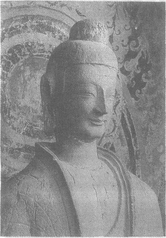 北魏。高112厘米。甘肃省天水市麦积山石窟第23窟正壁塑像。这尊佛头顶高肉髻,脸庞方圆适中,弯眉细眼,耳轮廓奇大,鼻梁挺秀,薄唇弧线上翘,颈较长,双肩微溜,线条圆润。内穿僧祗支,外着双领袈裟,以阴线构成简单的衣纹。此佛像的头部塑造极为精彩,其形象中所含宗教的庄重肃穆成分较少,更像一个外秀慧中,性情平和、气质不俗的青年形象。观者对这张刻画精致、传神入微的英俊面容均留下深刻印象,不禁对泥塑的表现力发出赞叹。