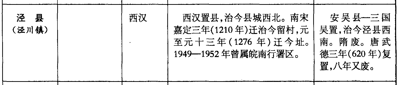 泾县(泾川镇)西汉西汉置县,治今县城西北。南宋嘉定三年(1210年)迁治今留村,元至元十三年(1276年)迁今址。1949—1952年曾属皖南行署区。安吴县—三国吴置,治今泾县西南。隋废。唐武德三年(620年)复置,八年又废。