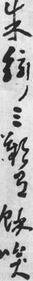 【赏析】: 面对这件近二米的立轴,最初的印象是笔致老辣,结构畸侧,可细细一揣摩,便觉得那不拘形迹之中暗含著一种郁闷的意味。汉字结构以右边较爲丰满,他此作中的字,右边却略显侷促,凡应该左向收势的线条,他写得那样彆扭难受。(如“急”字最后一点,“月、来”字之鈎。)在运笔时,他极少让笔锋正行,而是不停地绞转变换笔锋,作难动作的完成。这样线条有一定的力度和深度。但也因有时动作失控、或臃肿,乾瘦;或跳过意断,产生一种貌似艰涩实爲汚秽的效果。但我们不能忘记,这是一位病废后使用左手的人的作品。也许左手书法的魅力正在于此罢。 |