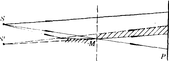 很小,因而屏P上的干涉条纹清晰,而且有较大的间距。洛埃镜干涉条纹与杨氏干涉实验中的条纹有所不同。首先,两束光的重叠区域(图中阴影部分)在M与P的交线以上,一般不呈现零级干涉条纹,也没有以零级条纹位置对称的下半部分条纹。其次,如果把屏移到几乎与M相接触的位置P′,根据杨氏实验原理,M与P′的交线处将出现零级明条纹,但是,实验中交线处是暗条纹。这一事实表明:射向交线处的两光线的距离相同,但却有位相差π,或者说有半个波长的光程差。直接射向交线的光线在空气中传播,当然不会发生特殊的变化,变化只能来自经过反射的光线。在反射过程中,反射光线有附加的位相π,或者说附加的半个波长光程差,这就是半波损失。因此,杨氏干涉实验中的明条纹处恰为洛埃镜实验中的暗条纹处,反之亦然。洛埃镜实验是反射时存在位相突变的最早实验证明。