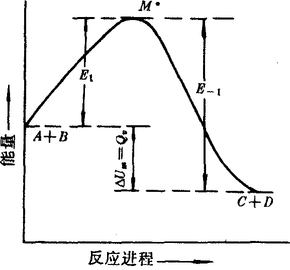 式中K1,K-1分别表示正、逆反应的速率常数。根据阿仑尼乌斯的观点,两个反应物分子碰撞,在变成产物之前需要经过一个活化态,反应物、产物和活化态的能量间的关系见下图。
