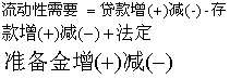 图中 (A) 表示在季节性存款变动中可通过连接各个波谷的低点连成一条趋势线,LD表示季节性流动性需要。在图中(B) 连接季节性贷款变动曲线的波峰得到一条趋势线,LI表示季节性流动需求。在图中 (C) 表示季节性和趋势线两种流动性需要综合起来的轨迹。其趋势性流动性需要的计算由贷款趋势变化减去存款趋势变化得出。差为正,是流动性要求; 差为负是流动性剩余,其季节性流动性需要的计算由贷款和存款二者的季节性,性需要相加之和得出。 在流动性需要具体计算时,还要将随着存款增减而引起法定准备金升降因素考虑进去,可按下列公式测算: