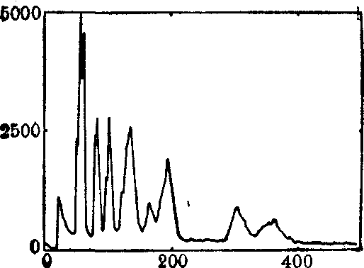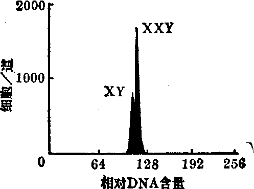 图3 用植物血凝素(PHA)转化的人外周血淋巴细胞A为二维散布点图,图中每个点代表1个细胞,其与座标的距离各相应荧光F530和F>600 B为三维等量图,图中峰的高度代表细胞数(随意单位)(据Darzykiewicz 1978) 此外,可用于测定细胞动力学参数,监视同步细胞群体在细胞周期中通过的情况(多重DNA分布),可得出细胞通过G1、 S和G2+M期的时间(TG1,Ts, TG2+M,Tc)及其变异系数(CVG1,CVs,CVG2+M,CVc),和细胞周期阻断和释放的情况,这对于了解肿瘤化疗干扰细胞周期动力学变化是一个很有效的方法。 FCM还可测定DNA合成率,细胞群体同步化的位置和程度,鉴别和分类死活细胞等。 (2)遗传学研究: FCP可用于染色体的DNA含量分析,得到染色体频率分布图(图4),称为流式染色体核型分析。同类型染色体出现一个峰,峰的面积代表这种类型染色体的丰度。用流式狭缝扫描系统可测定染色体的着丝粒指数。流式染色体核型分析技术不仅能快速分析染色体核型,而且能分类收集不同类型的染色体,供基因图和基因克隆的专门研究 。 图4 中国仑鼠M3-1细胞染色体的频率 不同遗传性状的个性,其体细胞含有不同数量DNA的染色体(XX,XY,XO,XXY等)。用流式细胞光度术可发现Klinefelter综合征患者白细胞(XXY)与正常男性白细胞(XY)中的DNA含量不同(图5)。 精子中DNA含