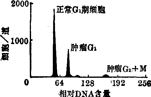 图5 正常男性和Klinefelter综合征患者混合的白细胞DNA分布(据Gohde等1980) 量的测定,可用来监视环境中有害物质对机体的影响。用于家畜新鲜冷冻保藏精子中带X或Y染色体精子的分析和分类,将会发展出一种能控制家畜性别的新方法。(3)免疫学研究: 在淋巴样细胞分析和分类方面,可用光散射鉴别活的淋巴和非淋巴细胞,测定淋巴样细胞大小的分布,并用光散射测定细胞的活性,利用免疫荧光方法可辨认和计数带有不同表面特异性抗原的细胞,如用荧光素标记的免疫球蛋白 (抗-Ig),就可鉴别T和B淋巴细胞。此外,又可根据细胞表面所带表面抗原的不同,分辨出不同的T和B淋巴细胞亚群,测出每个细胞所带抗原的数量、密度及其动力学参数,也可用流式细胞分类器对具有某种特异抗原决定簇正或负细胞的群体进行分类,进一步研究其功能特性。用双色荧光(FITC和TRITC)标记法可测定同一个细胞上的不同抗原决定簇的相关性。 FCP可定量分析结合于细胞的用荧光素标记的外源凝集素,用于测定细胞表面积和荧光素结合位点的相对密度,测定结合动力学,每个细胞结合位点的数目,以及研究外源凝集素之间与细胞表面结合的竞争性。 (4) 肿瘤学研究: 肿瘤细胞一般含有异常数量的DNA,在大多数实体瘤和急性白血病中发现非整倍体。由于FCP样品制备方法简单,测定结果精确,能快速得到DNA倍性的结果(图6),因而能提供有价值的诊断数据。在普通光学显微镜形态学观察不能做出可靠判断时,此方法的优点尤为突出。如果在测量DNA含量时,同时测定其他参数(如蛋白质含量、细胞大小、核质比等) 则可进一步提