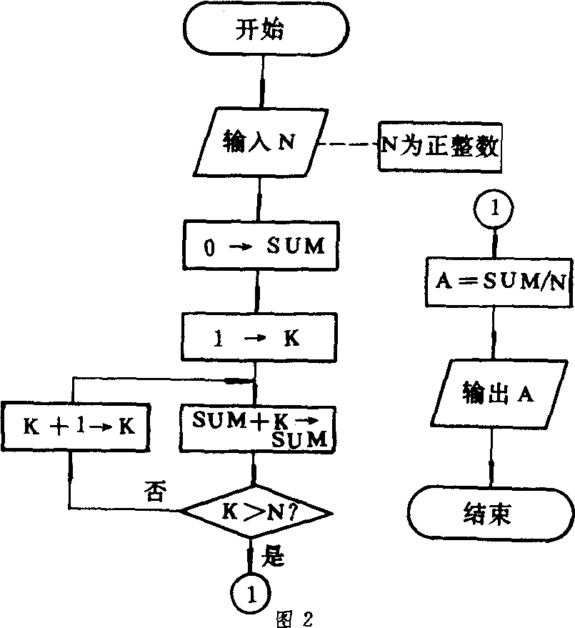 图2 ❸注释框为输入内容加注,指出要输入正整数. ❹处理框中的文字描述处理的内容,也是一个入口一个出口. ❺判断框有一个入口两个出口.框中的文字描述分支条件.比如这里K>N是条件,如条件满足,则以标有“是”的那条路径出口,否则从标有“否”的那条路径出口. ❻联接点的圆圈中的文字表示联接点的名称,分两处的同一个连接点应标同一名称.这里应将图中的两个❶视作同一点. ❼输出框也是一个入口一个出口,框中文字为输出内容. ❽结束框表示这段程序到此终止. 用上述流程图描述算法自由灵活,但由于它要用带箭头的流程线去指示程序执行的先后顺序,这些线转来转去,多了会使人眼花缭乱,不利阅读、修改、调试和维护. (吴文虎) N—S结构流程图(N-S jiegou liuchengtu) 以I.Nassi和B.Shneiderman命名的结构化的流程图,简称N-S图. N-S图含有三种基本控制结构: ❶顺序结构 指按顺序一步一步执行的结构.每个矩形框是一种(一系列)基本运算.两个以上矩形框组成顺序结构.如图1. ❷分支结构(选取结构)见图2.图中倒三角表示分支条件,其左下方为满足该条件应执行的分支,右下方为不满足该条件应执行的分支,满足条件用True表示,不满足条件用False表示,可简写为T和F. ❸循环结构 循环结构有两类,一类为“当”型循环,一类为“直到”型循环.这两种结构略有不同,见图3和图4,“当”型的循环体框放在右下角;“直到”型放在右上角. “当”的含意为:当条件R满足时就执行循环体,只有R条件得不到满足时才退出循环. “直到”型循环的“直到”二字的含意为:直到R条件满足时才退出循环,否则要重复执行循环体.