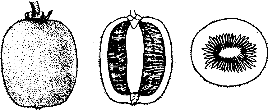 图 1 葡萄果粒的内部构造 左. 纵切面; 右. 横切面 1. 柱头底; 2. 果心维管束; 3. 维管束环4. 果心; 5. 种子; 6. 果蒂 葡萄的果实构造(图1)。果皮最外是一层表皮细胞,致密而光滑, 上覆蜡质果粉。表皮下8~10层壁较厚的细胞,幼果时含叶绿体, 成熟时褪绿; 有色品种含花青素, 呈现黄、红、紫、黑等不同色彩。在有香气的果实中, 外果皮还含有芳香物质, 不同种和品种香型不同, 如欧亚种的许多栽培品种为玫瑰香型, 美洲种多为草莓香型。中果皮与内果皮形成柔软多汁的果肉, 仅由维管束环将其分为内外两层。最内层是内表皮细胞。果肉中有无色素,依品种而异, 如玫瑰香、黑罕、巨峰、佳利酿等品种, 果肉无色素, 果汁白色;紫北塞、黑赛比尔等品种及河岸葡萄、燕垒、山葡萄, 果皮和果肉都有色素, 果汁红色。内表皮以内为心室, 由2个心皮构成, 每室2个胚珠, 形成1~2粒种子, 个别品种无籽。种子与果肉分离的难易, 因种而异, 美洲种有肉囊, 不易分离; 欧亚种无肉囊, 易分离。果粒与果柄相接膨大处, 称果蒂。果柄内部有维管束直达果顶, 并有分支与果肉及种子相连, 去粒后仍留在果柄上, 称果刷。不同品种果蒂、果刷有一定差异。 猕猴桃的果实构造(图2、3)。外表皮多为褐色,由一层木栓化细胞形成, 皮孔和表皮有毛或无, 因种而异。中华猕猴桃, 表皮常具单细胞毛、单列多细胞毛和多列多细胞毛。果皮下的果肉组织, 由圆或近圆形的薄壁细胞组成, 大小不一,直径20~200微米。果心中央有一果心轴, 由小型的长圆形薄壁细胞组成。整个果肉遍布许多大型异细胞,为分泌组织, 内含粘液。每室含多数胚珠, 形成许多小型棕色种子。种子纵扁椭圆形,种皮有网纹,由一层被角质的木栓化细胞组成。胚小, 胚乳发达, 由6层以上多角形无间隙的薄壁细胞组成, 内含大量淀粉。
