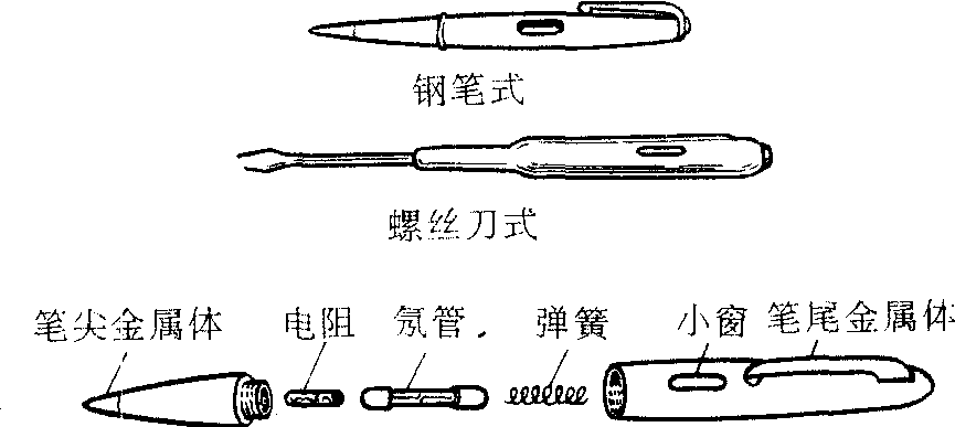 | 释义 | 测电笔 测电笔cedianbi测试导线、电器和电气设备是否带电的常用电工工具,又称试电笔。外形通常有钢笔式和螺丝刀式两种(见图),钢笔式测电笔由笔尖金属体、电阻、氖管、笔杆小窗、弹簧、笔尾金属体等部分组成。如果把测电笔的笔尖金属体与带电物体(如火线)接触,笔尾金属体与人手接触,氖管就会发光,笔内的电阻大约1~2兆欧,当电流通过时,人并无触电感觉。氖管发光,证明被测物体带电。这样可判断电路是否带电,判断火线和零线。测电笔在每次使用之前要在带电的火线上预先进行测试,检查它是否完好。低压测电笔只能在对地电压250伏以下使用。