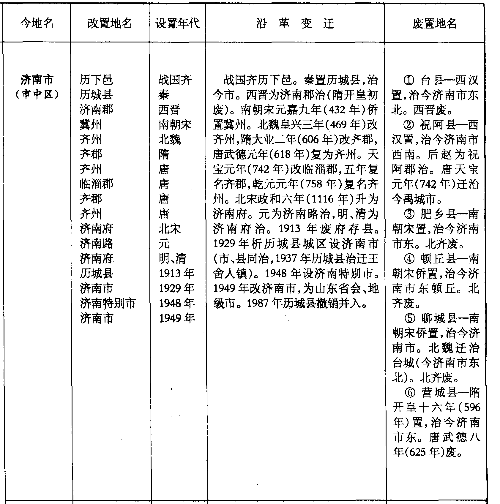 战国齐历下邑。秦置历城县,治今市。西晋为济南郡治(隋开皇初废)。南朝宋元嘉九年(432年)侨置冀州。北魏皇兴三年(469年)改齐州,隋大业二年(606年)改齐郡,唐武德元年(618年)复为齐州。天宝元年(742年)改临淄郡,五年复名齐郡,乾元元年(758年)复名齐州。北宋政和六年(1116年)升为济南府。元为济南路治,明、清为济南府治。1913年废府存县。1929年析历城县城区设济南市(市、县同治,1937年历城县治迁王舍人镇)。1948年设济南特别市。1949年改济南市,为山东省会、地级市。1987年历城县撤销并入。