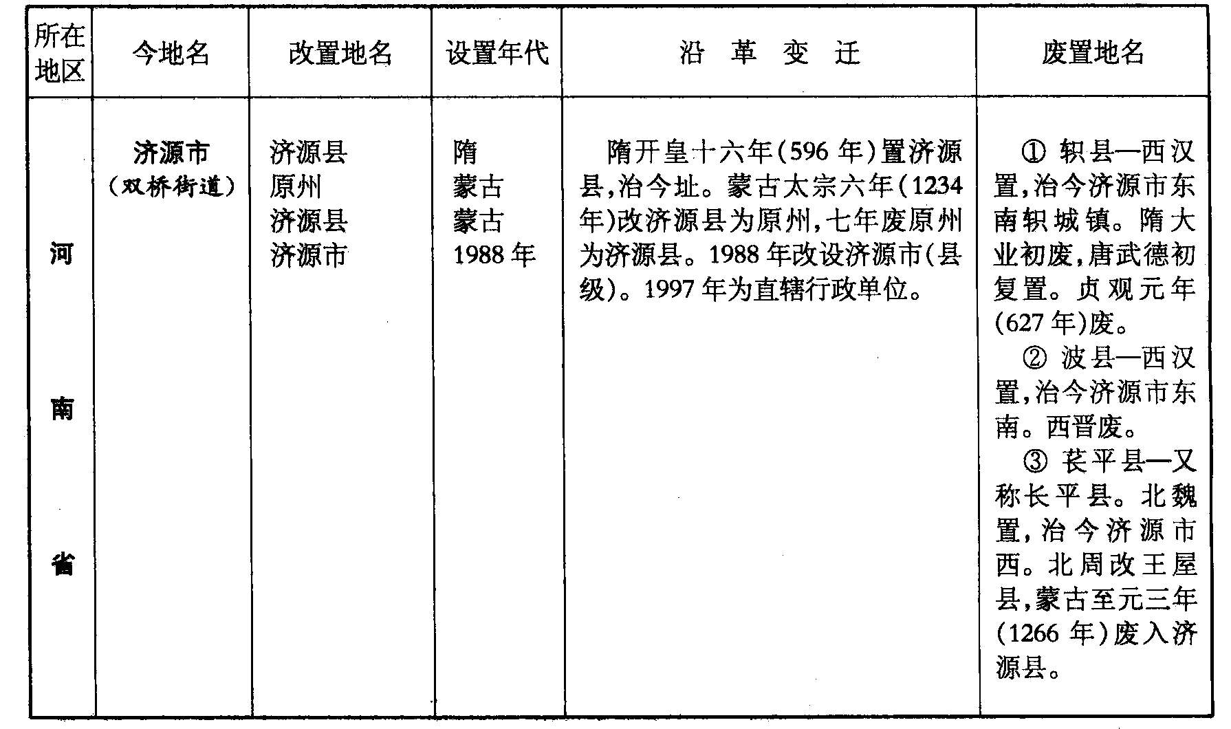 济源市(双桥街道)济源县原州济源县济源市隋蒙古蒙古1988年隋开皇十六年(596年)置济源县,治今址。蒙古太宗六年(1234年)改济源县为原州,七年废原州为济源县。1988年改设济源市(县级)。1997年为直辖行政单位。❶ 轵县—西汉置,治今济源市东南轵城镇。隋大业初废,唐武德初复置。贞观元年(627年)废。❷ 波县—西汉置,治今济源市东南。西晋废。❸ 苌平县—又称长平县。北魏置,治今济源市西。北周改王屋县,蒙古至元三年(1266年)废入济源县。