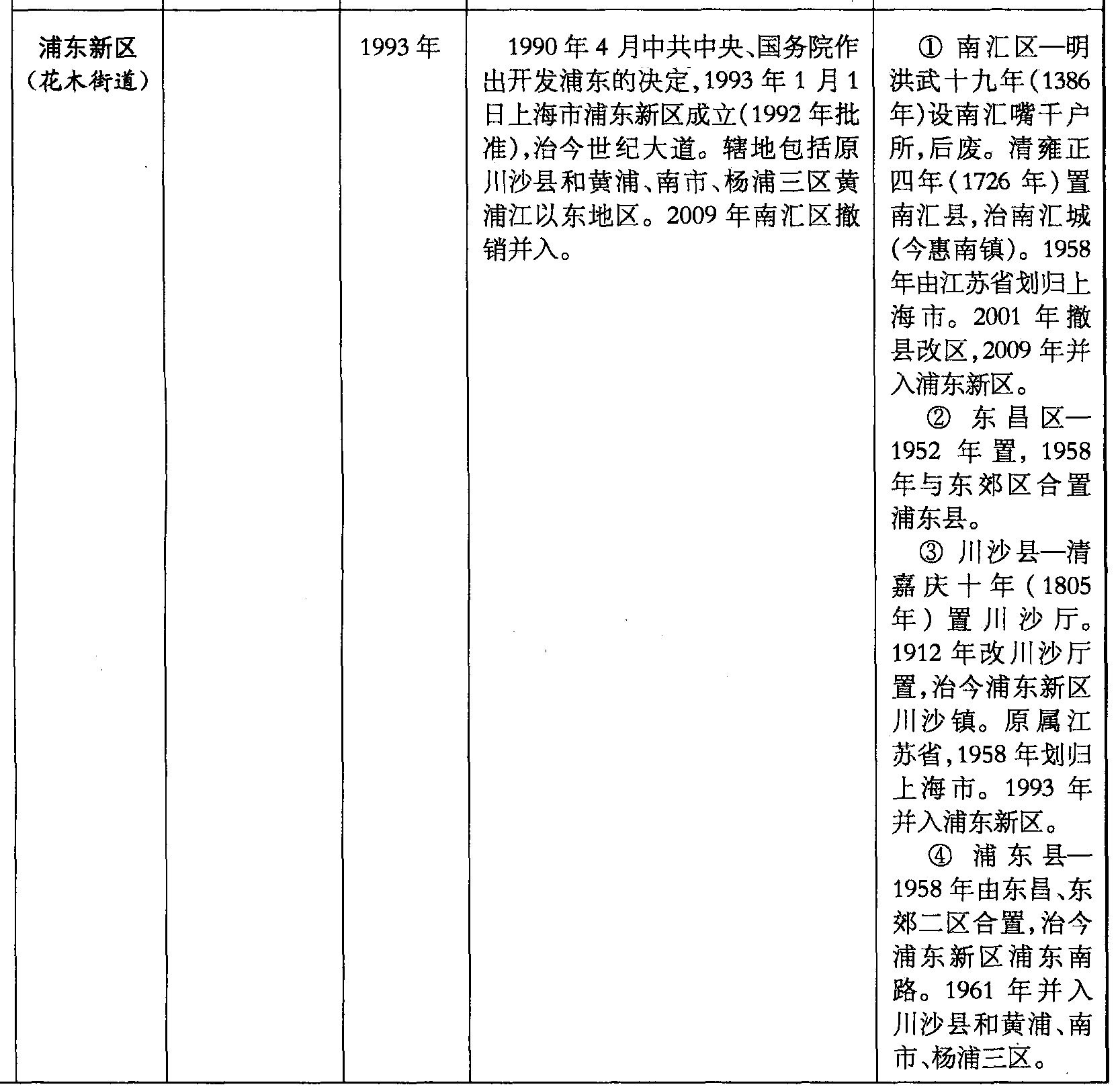 浦东新区(花木街道)1993年1990年4月中共中央、国务院作出开发浦东的决定,1993年1月1日上海市浦东新区成立(1992年批准),治今世纪大道。辖地包括原川沙县和黄浦、南市、杨浦三区黄浦江以东地区。2009年南汇区撤销并入。❶ 南汇区—明洪武十九年(1386年)设南汇嘴千户所,后废。清雍正四年(1726年)置南汇县,治南汇城(今惠南镇)。1958年由江苏省划归上海市。2001年撤县改区,2009年并入浦东新区。❷ 东昌区—1952年置,1958年与东郊区合置浦东县。❸ 川沙县—清嘉庆十年(1805年)置川沙厅。1912年改川沙厅置,治今浦东新区川沙镇。原属江苏省,1958年划归上海市。1993年并入浦东新区。❹ 浦东县—1958年由东昌、东郊二区合置,治今浦东新区浦东南路。1961年并入川沙县和黄浦、南市、杨浦三区。