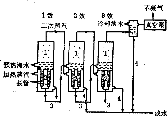 竖管蒸馏流程示意图 1. 蒸发室 2. 加热室 3. 浓海水 4. 冷凝水