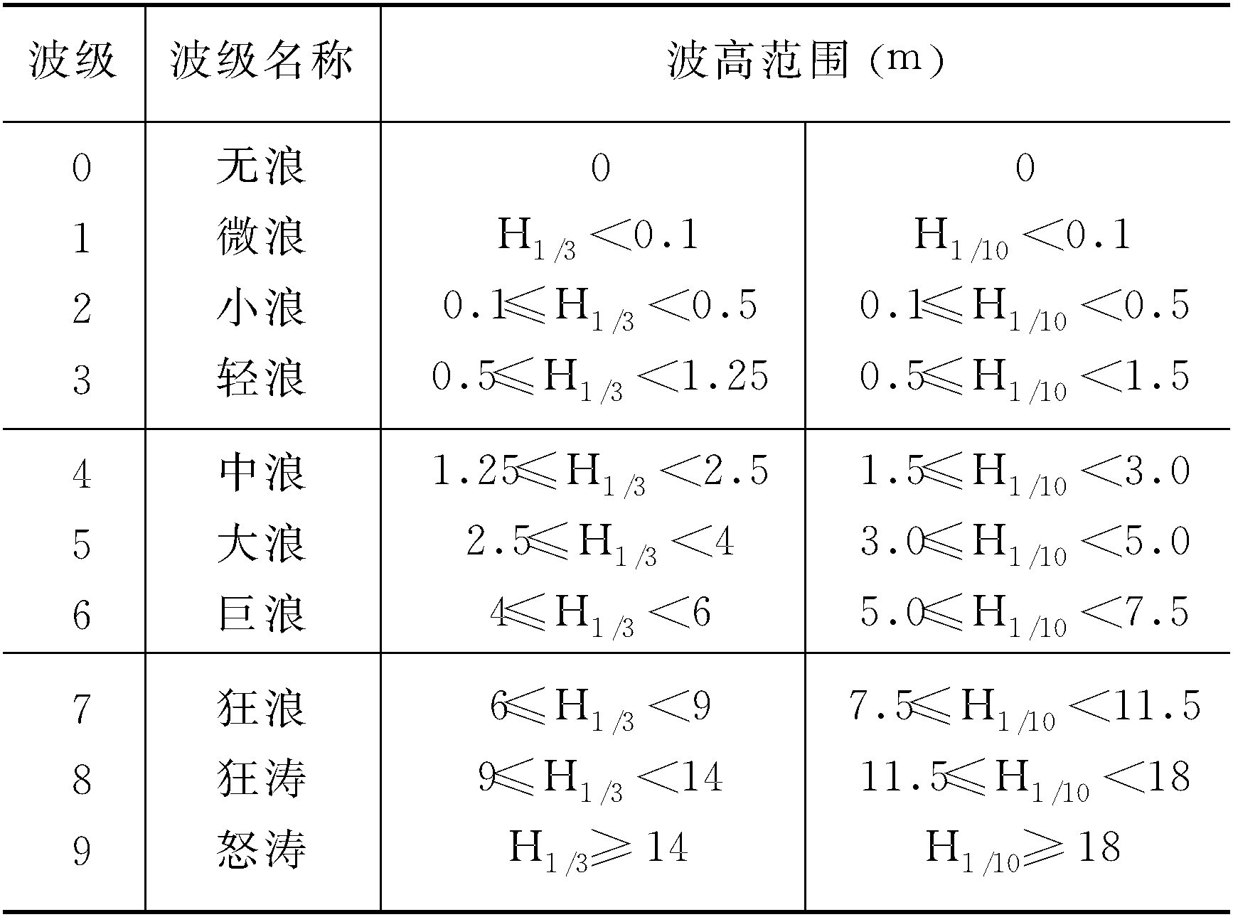 海面波动程度的分级。波浪愈高其级别愈大。有的将风浪、涌浪分别定级,也有的依同一标准分级。波级可根据有效波高(H1/3)或1/10大波波高(H1/10)进行分级。波级表如下所示。