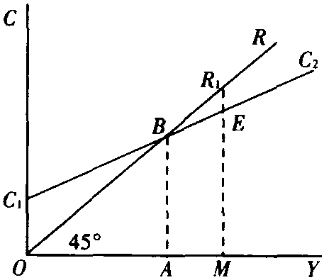 消费曲线xiāo fèi qū xiànкрив я потреблéния消费曲线Consumption Curve用来表示消费与收入之间函数关系的曲线,是消费函数的图形表示。用横轴表示收入水平,纵轴表示消费水平。OR为边际消费倾向为1时的消费曲线,其与横轴的夹角为45度,OR线上的任何一点都表示消费等于储蓄。CC′为另外一条消费曲线,与OR相交于B点,表示收支均衡点。在该点上,OA=AB,表示收入全部被消费。在B点左面,C>Y,表示消费大于收入,有负储蓄;在B点右面,C.jpg)
