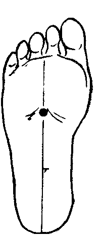 图116 涌泉Yungch′uan系足少阴肾经上的一个针灸穴位。此穴位于足底前、中1/3的交界处。施针时直刺0.3~0.5寸。主治昏迷、休克、窒息、头颈痛、咽喉痛、癫痫、癔病、小儿惊风、呕吐不止、精神分裂症等。 涌泉经穴名。别名“地冲”。属足少阴肾经,井穴。位于足心前1/3的凹陷中。主治:头顶痛,头晕眼花,咽喉痛,失音,舌干,小便不利,大便难,小儿惊风,昏厥,足心热等。直刺0.5—0.8寸;可灸。 涌泉 涌泉足少阴肾经穴。取穴:在足心陷中,屈足卷指足底前三分之一处。主治:头顶痛、头昏、失眠、目眩、咽喉肿痛、舌干、失音、鼻出血、中风、小便不利、大便难、小儿惊风、癫痫、晕厥、癔病、下肢瘫痪。刺灸法:直刺0.5~1寸,针不宜刺深。针感可直达巅顶。艾炷灸3壮;艾条灸3~5分钟。 ☚ 昆仑 太溪 ☛ 涌泉yǒngquán经穴名。代号KI1。出《灵枢·本输》。别名地冲。属足少阴肾经。井穴。在足底, 屈足卷趾时足心凹陷处, 约当足底第二、三趾蹼缘与足跟连线的前1/3 与后2/3 交点。主治休克、昏厥、小儿惊风、高血压、癫痫、头顶痛等。直刺0. 5 ~1 寸。灸3 ~5 壮或5 ~10 分钟。