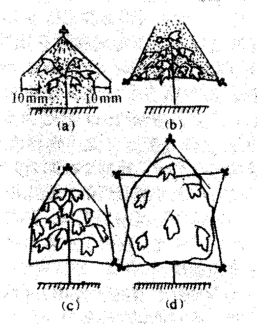 [作业参数:H=50cm;p=3×105Pa;θ=80°(1、3),110°(2);vF=3.6km/h] 圆锥雾喷头 又有空心圆锥雾喷头和实心圆锥雾喷头之分。前者雾化质量较好。当喷量小和喷施压力高时,可产生较细的雾滴,用于喷施杀虫剂和杀菌剂(图2.1);后者的雾流中间部分的药液未能充分雾化,但穿透力较强。 扇形雾喷头 按其沉积雾型又分两种: 一是中间药液沉积量大,向两侧逐渐递减的常用形式(图2.2),适合安装在水平喷杆上使用,可获得喷幅内药液均匀的沉积分布; 二是药液沉积分布近似矩形的均匀平雾式(图2.3),特点是单个喷头喷幅内沉积量均匀,适合于在作业行上进行带状喷药。主要用于喷施除草剂。(见彩图72) 导流式喷头 所喷出的雾面也为扇形,但雾化质量较差,药液沉积分布是中间少、两侧多(图2.4)。安装在水平喷杆上使用时,喷雾沉积雾形应是100%的重叠来保证药液在喷幅内沉积的均匀性。导流式喷头也主要用于喷施除草剂。 喷雾性能和影响因素 用于评价液力式喷雾器喷雾性能的主要指标有喷量(升/分)、雾滴谱(雾滴直径及雾滴尺寸分布范围等)、喷雾角(度)和射程(米)。对这些指标的影响因素有喷头结构、液压力大小和药液的物理性质。 喷头结构和液压力 空心圆锥雾喷头的结构如喷孔尺寸、进液通道或螺旋槽的斜度(与水平面夹角)和通道截面积,涡流室深浅以及喷头片喷孔处的厚度与直径的比例等,其影响是: 喷孔大和进液通道截面积大时,喷量和雾滴直径大; 进液通道斜度大和涡流室深时,喷雾角小、射程远、雾滴直径也大; 喷头片喷孔处的厚度大时,则喷雾角变小。扇形雾喷头的结构,如喷嘴出口截面积和形状等对喷量、喷雾角、雾滴直径和药液沉积分布形式有影响。喷头结构不变时,增大喷施液压力,则喷量增加,喷雾角变大,雾滴直径变小,小雾滴量增加,射程增加。在农业生产中,是以换用不同喷孔尺寸的喷孔片(圆锥雾喷头)或喷嘴(扇形雾喷头)来满足各种喷量要求。用调整圆锥雾喷头涡流室深浅的方法来改变射程。大田喷药作业时,一般不使用增减喷施压力的办法改变喷量,因液压力变化影响到喷雾性能的其他指标,只在少量变动喷量时才予采用。 药液物理性质 表面张力和粘度对雾面的形成和药液雾化有影响,因而也影响了喷量和雾滴直径。一般来说,药液的表面张力和粘度大,雾滴直径也大;但粘度过大时将破坏液膜的正常形成,故液力式喷雾机具只适合喷施粘度不大的以水作为载体的农药。 使用 可用在大田、果园、苗圃的病,虫、草害防治,也可用于人、畜卫生和仓库消毒,适合作针对性喷雾。包括喷药准备和作业两部分。 喷药准备 包括喷头选择,估计作业行进速度。添加药剂和水: ❶估测行进速度。确定喷雾机具田间作业行进速度或选择合适喷孔尺寸的喷头,可参照关系式(见喷雾机具)。使用手动喷雾器在大田作业时,可先测定喷量、喷幅。确定施药液量后,再计算作业时行进的速度。拖拉机拖带喷雾机作业时,在田间先测定其实际行进速度(视地面状态而定,一般不超过8千米/时),根据施药液量范围和喷幅,选择合适喷量的喷头; 也可采用与手动喷雾器作业相同的方法确定行进速度。 ❷加药和加水。向药液箱内添加药剂和水时,必须经过严格过滤。小喷量扇形雾喷头的狭缝出口尤其易被药液中的杂质颗粒堵塞,药液过滤应特别仔细。向手动喷雾器补充药液的方法是先将药剂和水搅拌均匀后再加入药液箱。向机动喷雾机补充水和药剂后,应先传动液泵将药液搅拌均匀才可喷施。 田间作业 包括大田及果园防治病虫害和大田除草。 防治大田病虫害时,根据作物形状,生长发育状况和病虫发生或栖息地点,手持喷杆(spray lance)向靶标喷施(图3a),或在水平喷杆(spray boom)上配置多个喷头,从各个角度向靶标喷施(图3b、c、d),常用的喷施压力为0.25~0.5兆帕。